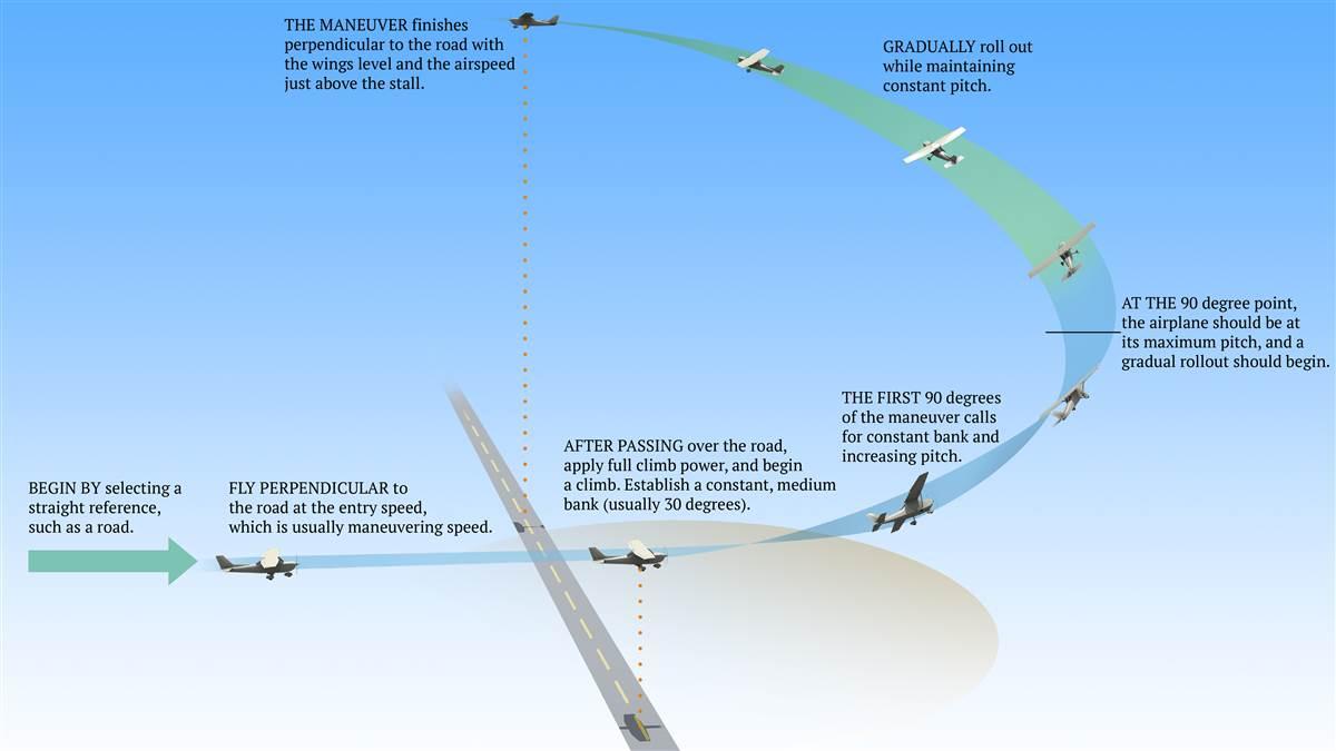 How to Perform: A maximum-performance climbing turn. Roll into a 30-degree bank, then smoothly apply maximum back pressure to climb. At the 90-degree point of the turn, begin rolling wings level while still climbing.