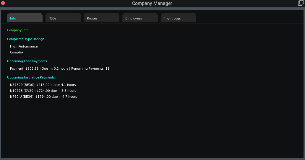 Company Info Tab: Added a new info tab to the company manager. This will display all type ratings earned as well as upcoming loan and aircraft insurance payments.