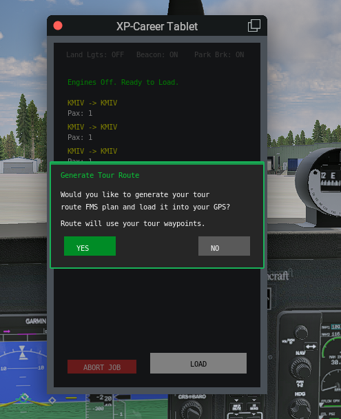 SimBrief Support: Job routes in the tablet window can now be click and sent to SimBrief to generate a route. The route can then automatically be loaded into a generic X-Plane 12 GPS system. Route files will also be generated for the Zibo B738 and the RXP GTN system which can be imported and loaded.