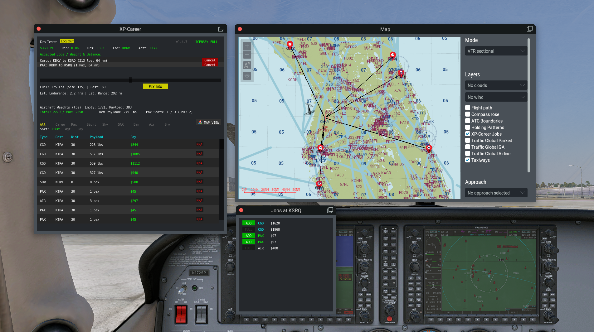 Jobs Map View: You can now open the X-Plane VFR Map to view the XP-Career Jobs layer to view all available job routes from your location. You can also click on a destination (2D mode only) to view and add jobs at that destination.